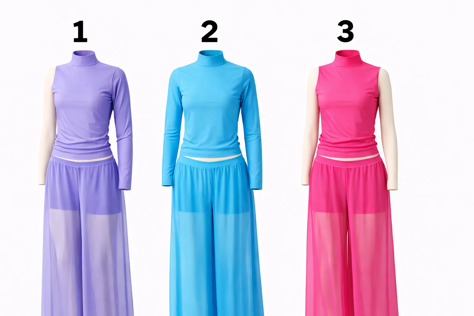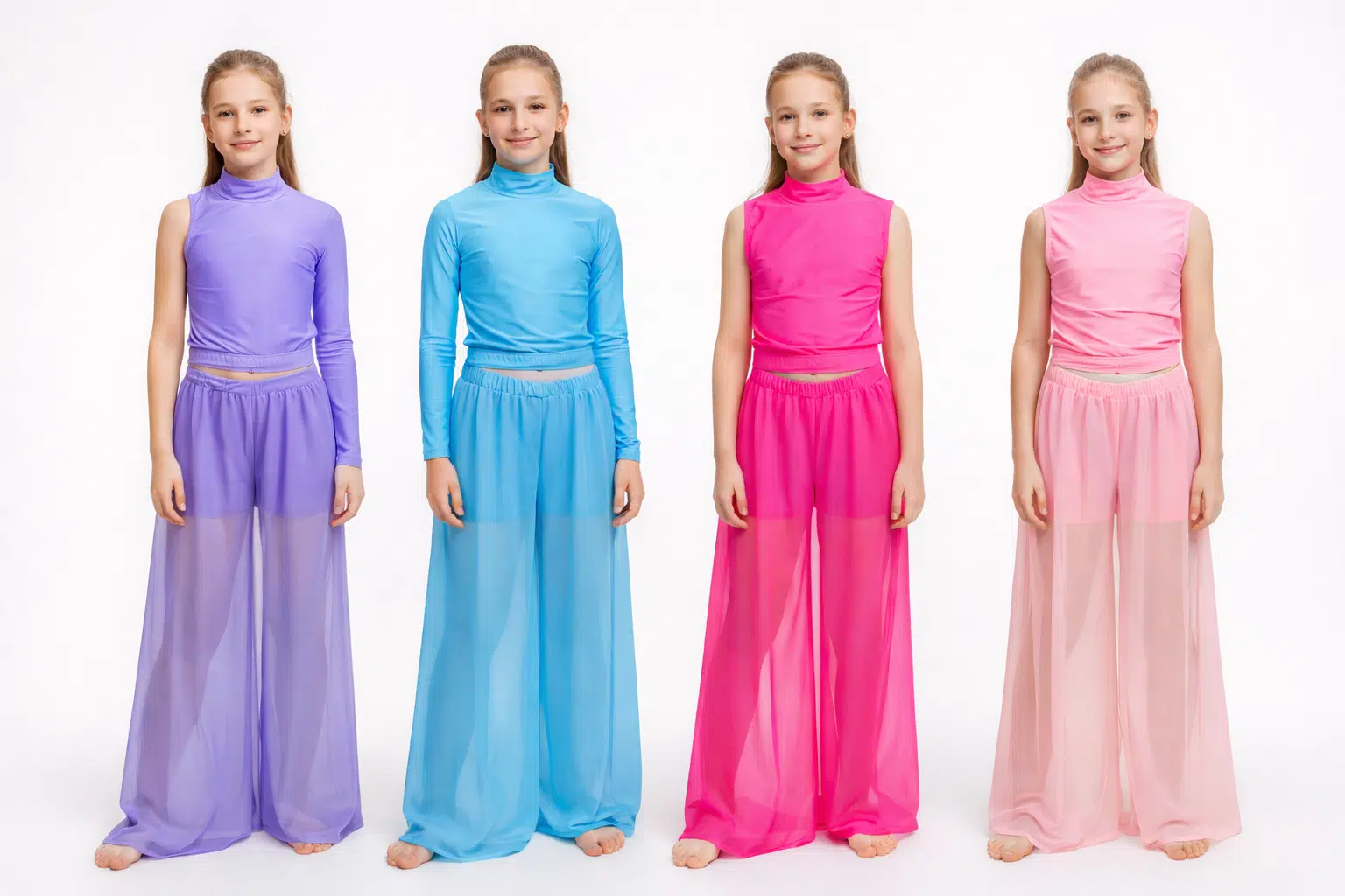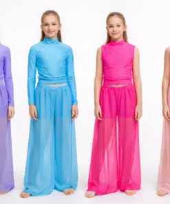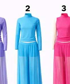 Kõrge kaelusega tantsukostüüm laienevate pikkade pükstega
